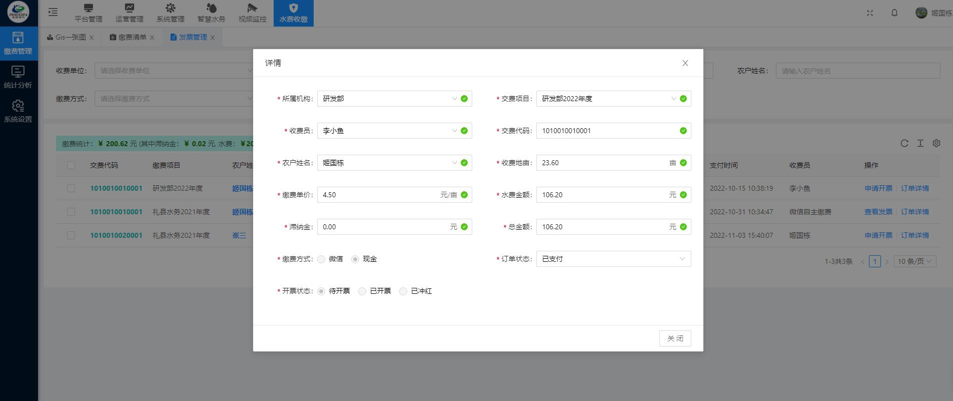計(jì)量:專業(yè)流量計(jì)量設(shè)備對用戶水的用水量進(jìn)行精準(zhǔn)計(jì)量,系統(tǒng)自動計(jì)算生成水費(fèi)賬單信息。